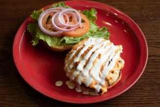 Seasoned beef patty topped with house-made creamy buffalo chicken dip, mozzarella, bleu cheese crumbles, lettuce, tomato, raw onions and drizzled in ranch served on a toasted brioche bunkhouse-made